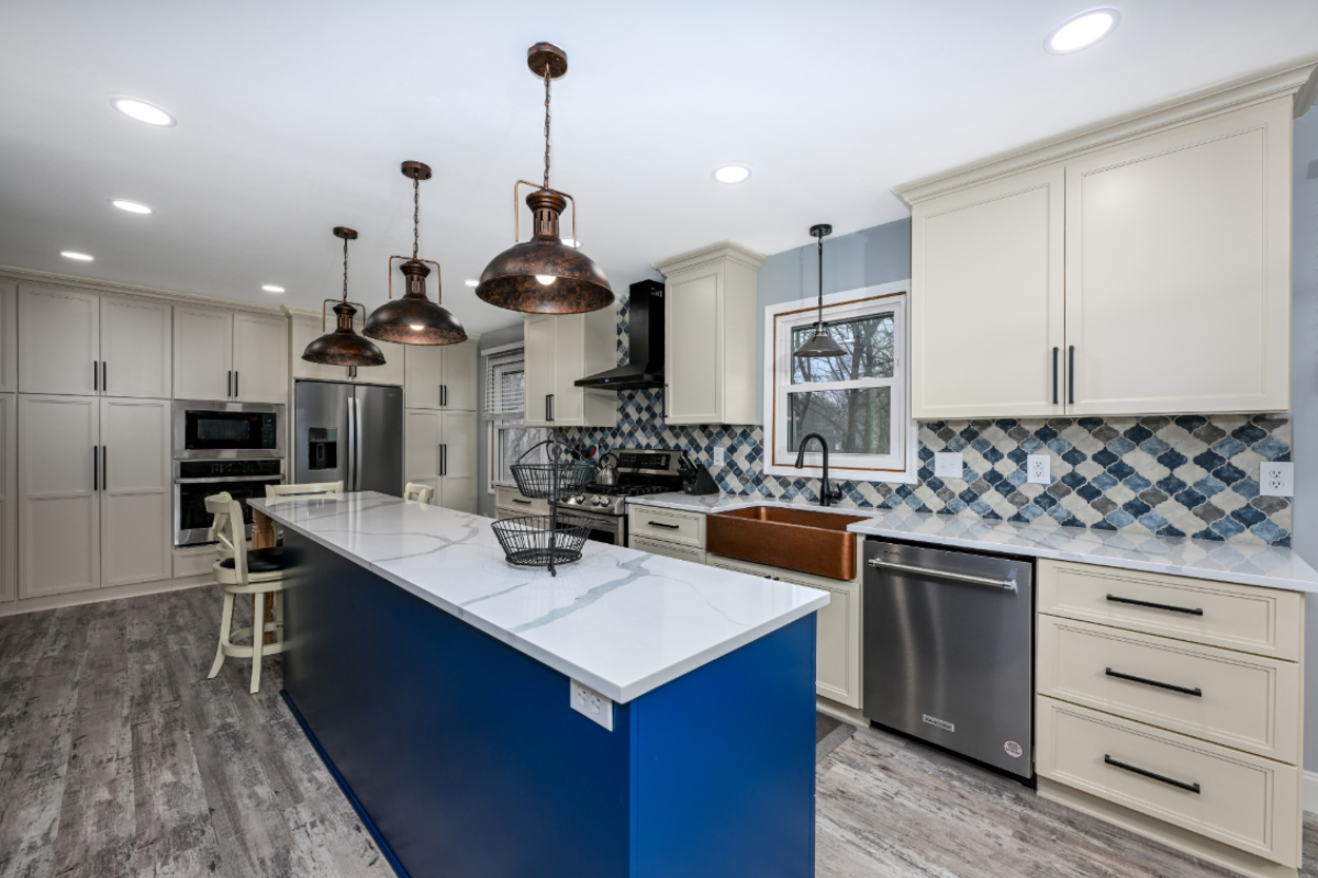Inspiration: Pair bright cabinetry with matte black lighting or navy island bases for a sophisticated two-tone effect.
