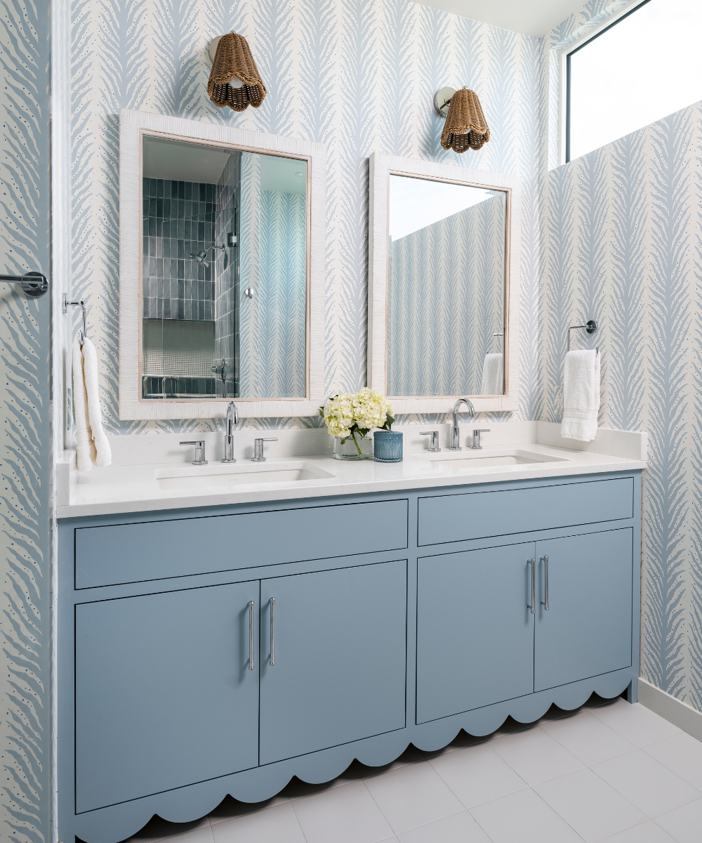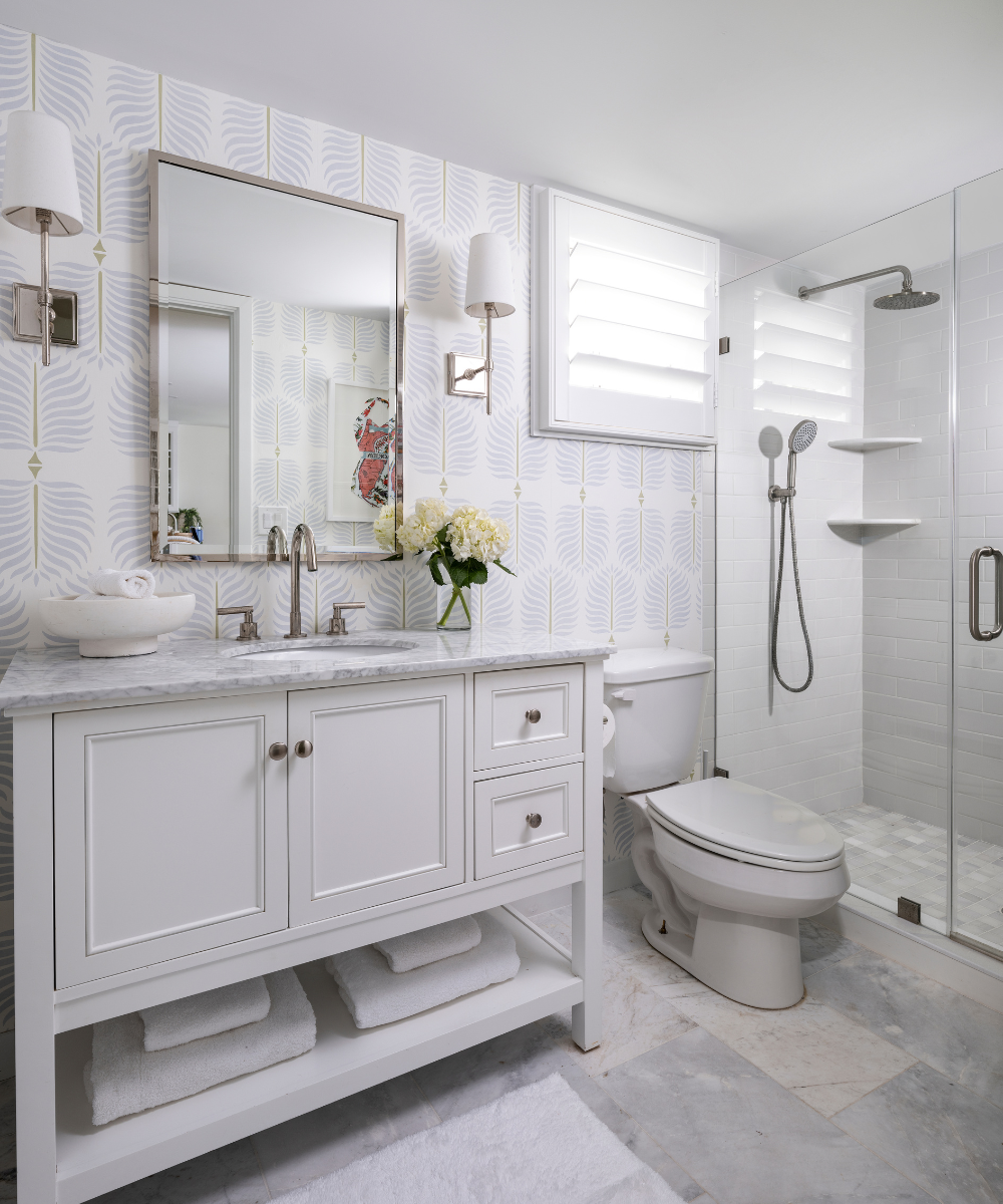 This project embraces a lighter, more relaxed approach to design—layering soft neutrals, subtle patterns, and coastal-inspired tones to create spaces that feel both fresh and timeless. Crisp white cabinetry sets a clean foundation, while moments of color and texture—from soft blues to patterned wallcoverings—add personality without overwhelming the space.